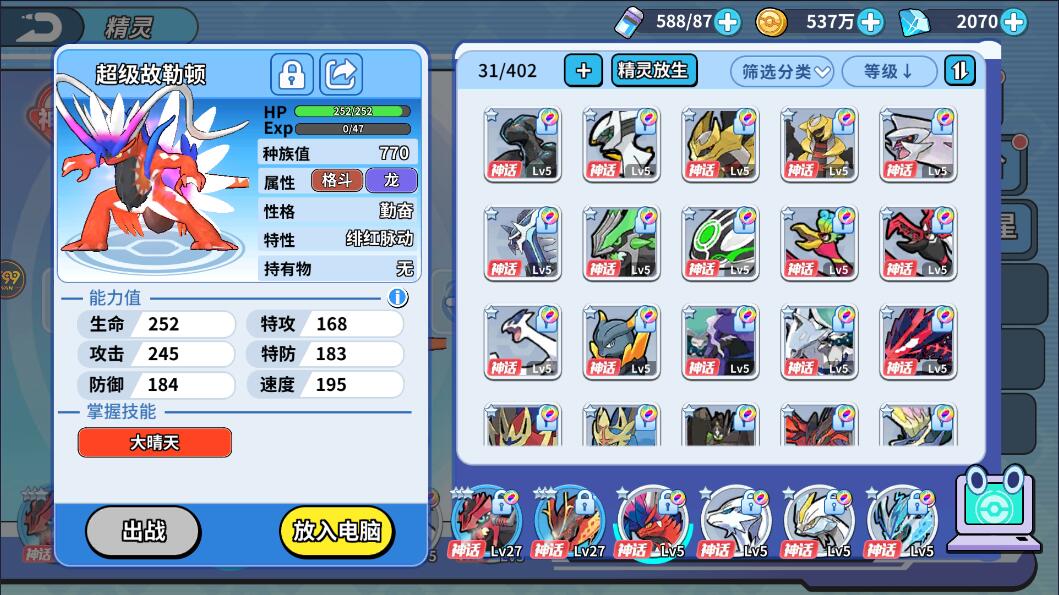 历史充值70000元:自选闪光超级精灵(已有图鉴的精灵)*1、神话特性胶囊选择礼包*1、神奇药剂*999、闪光笛子*24、金色王冠*4